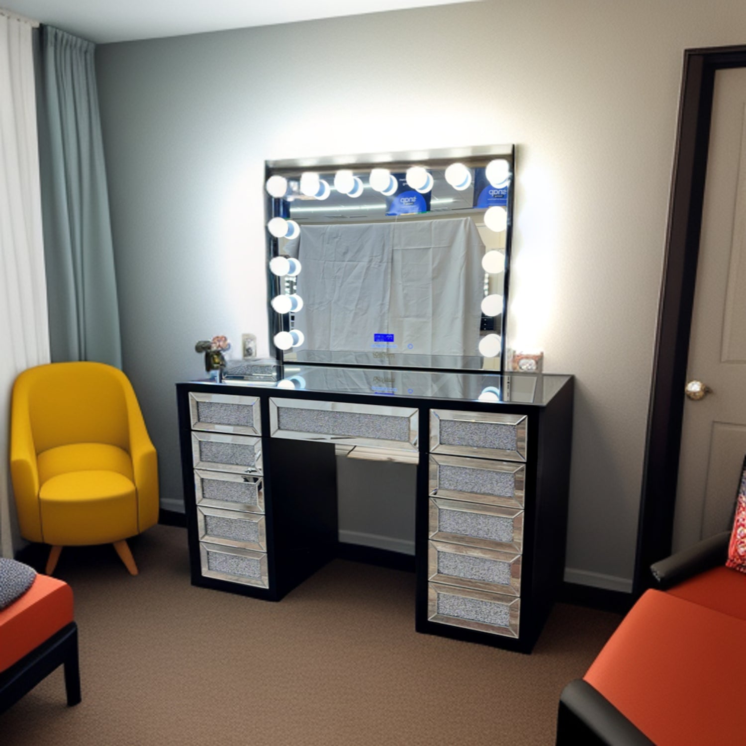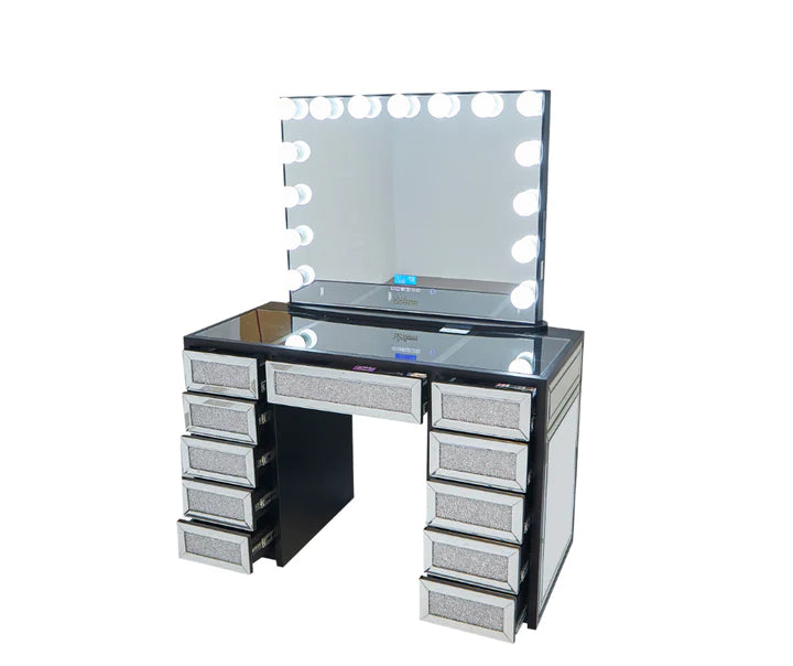The tabletop features Impressions Vanity’s signature clear-glass top to showcase the best vanity accessories in your collection. Mount your favorite Hollywood Vanity Mirror with the pre-drilled holes!