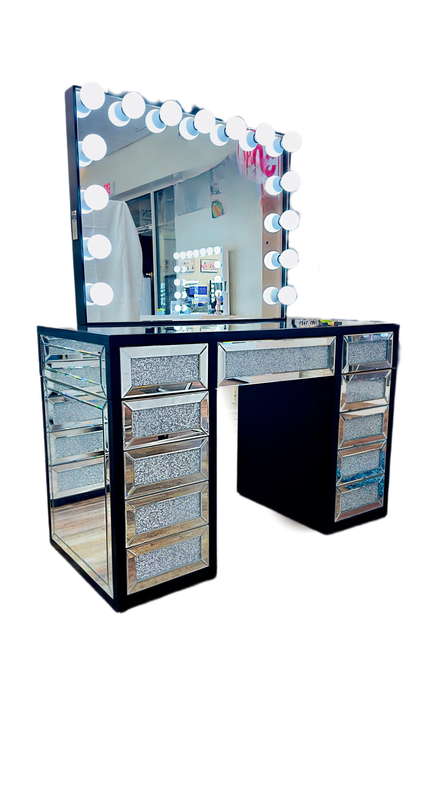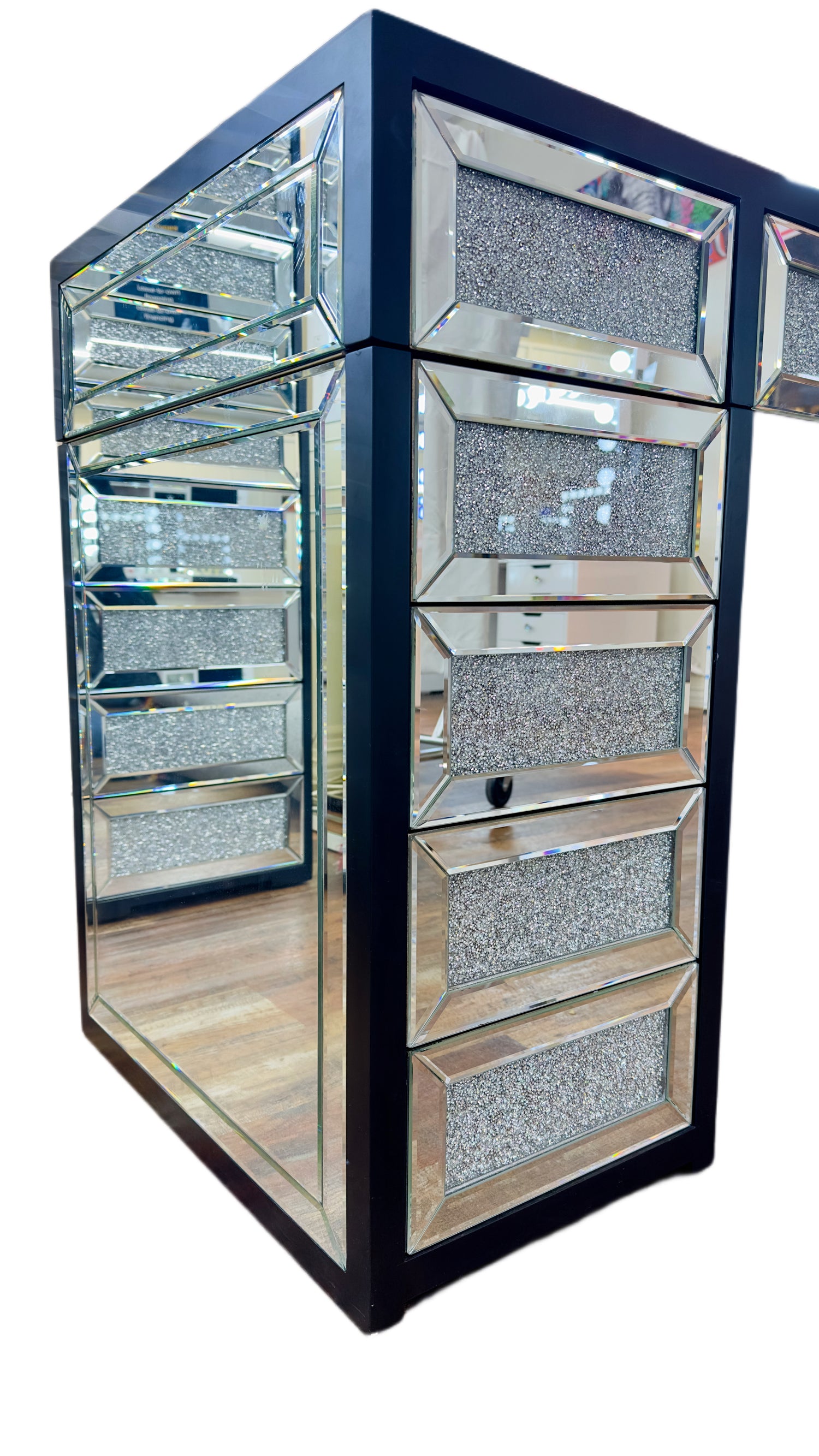 The sides of this SlayStation feature stunning mirrored panels. All of the drawers gleam with a crushed diamond design and are surrounded by a mirrored border. Say goodbye to knobs on your vanity set! Simply push the drawer to open and close.
